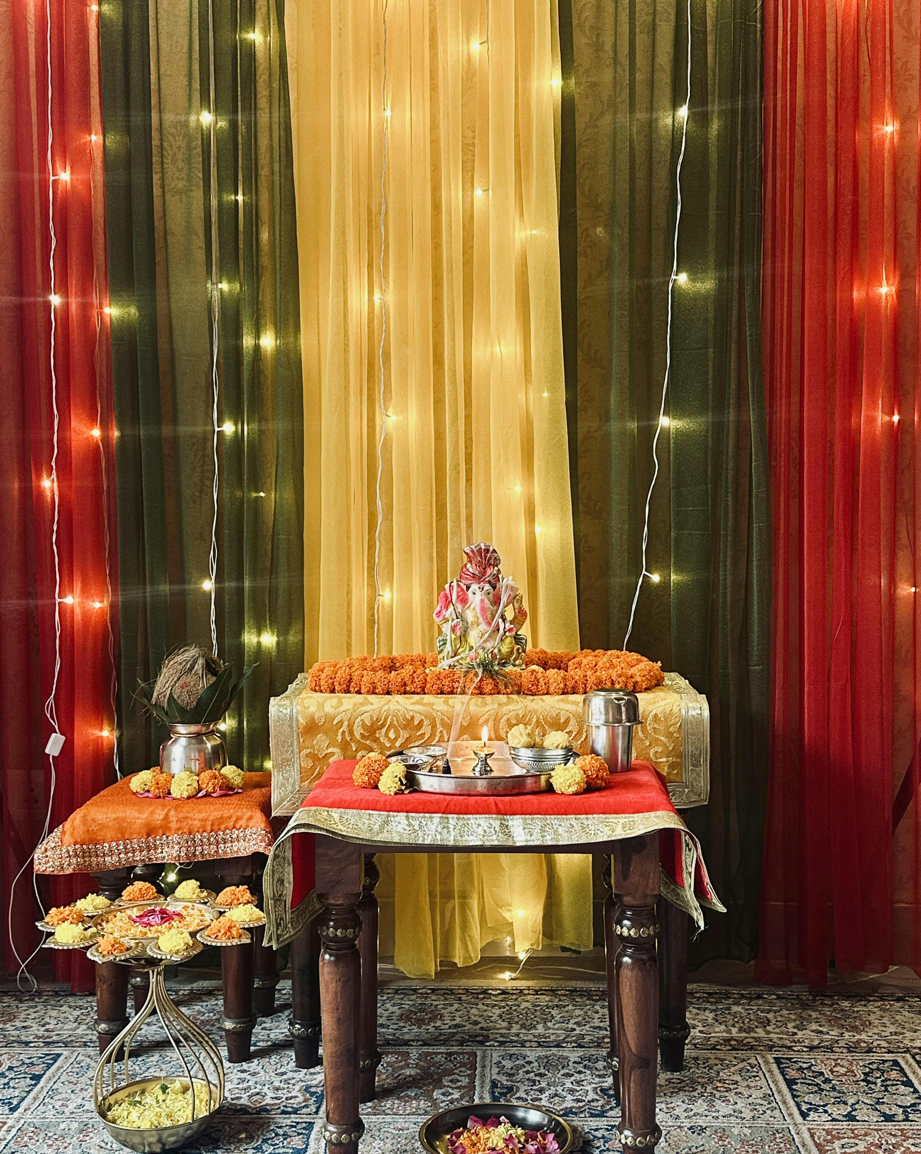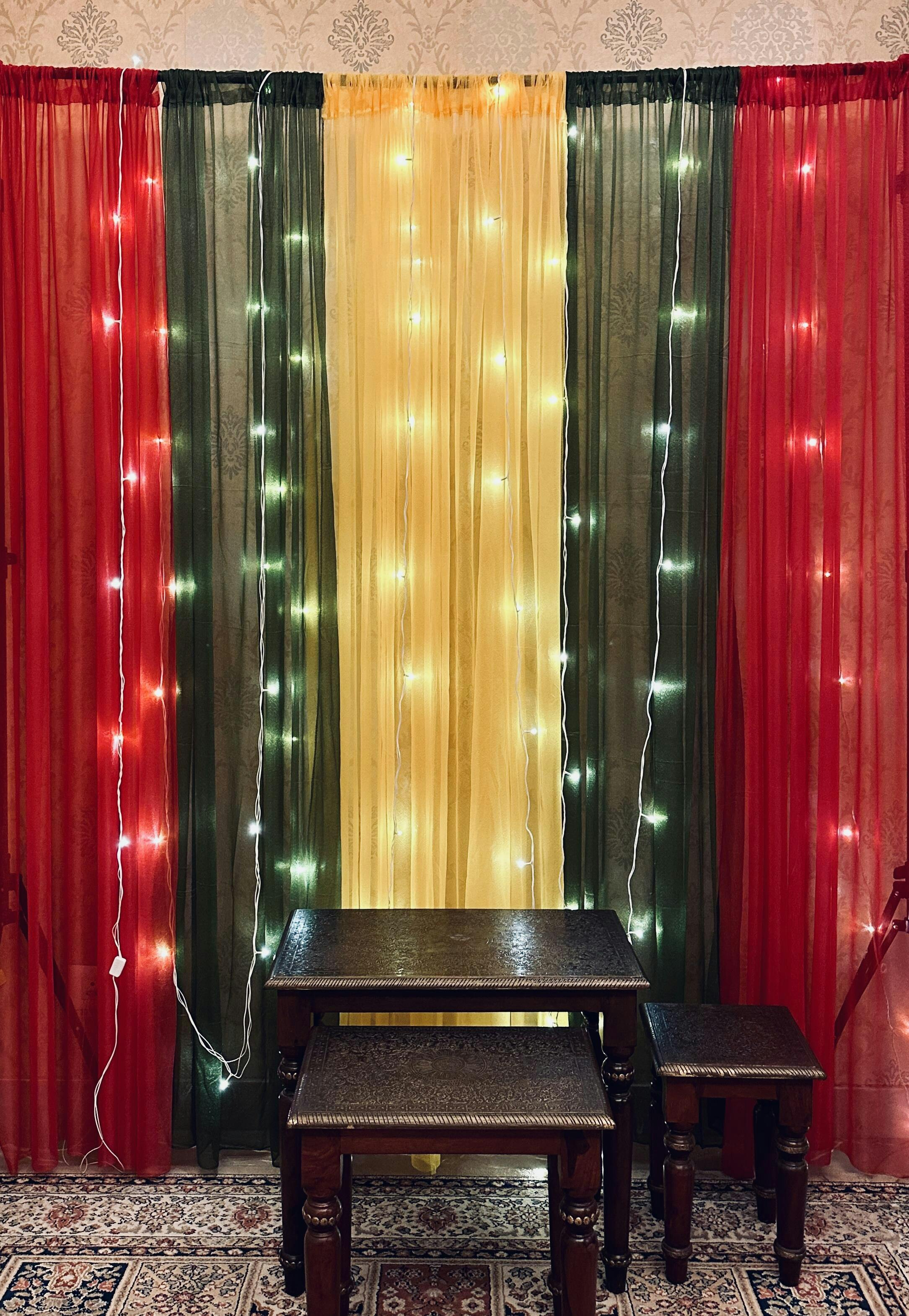 Ganpati Festive Decor-13 Items Chiffon Like Fabric Stitched Green, Red and Yellow Cloth with Fairy led lights for backdrop decoration for wedding, home decor